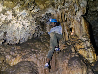 Deuxième tentative fructueuse. Je me retrouve dans une petite galerie d'environ 1,5*1,5 m de section pour 3 m de long, qui redescends. La suite s'abaisse et semble se boucher mais une avancée tête première laisse entrevoir un passage étroit entre 2 coulées avec à nouveau du vide derrière. Pas envisageable d'y aller dans ce sens. Je remonte et envoie mes pieds en première. çà passe au cm! S'en suit alors un méandre descendant. Il me semble d'abord percevoir du grand noir mais l'éclairage à fond laisse finalement deviner le sol environ 2 mètres plus bas, sans pouvoir voir si çà passe dessous.
